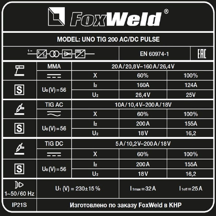| Комплект поставки | Аппарат аргонодуговой сварки FOXWELD UNO TIG 200 AC/DC PULSE – 1 шт.; Горелка TIG-26 4 м – 1 шт.; Зажим для заземления с кабелем 25 |