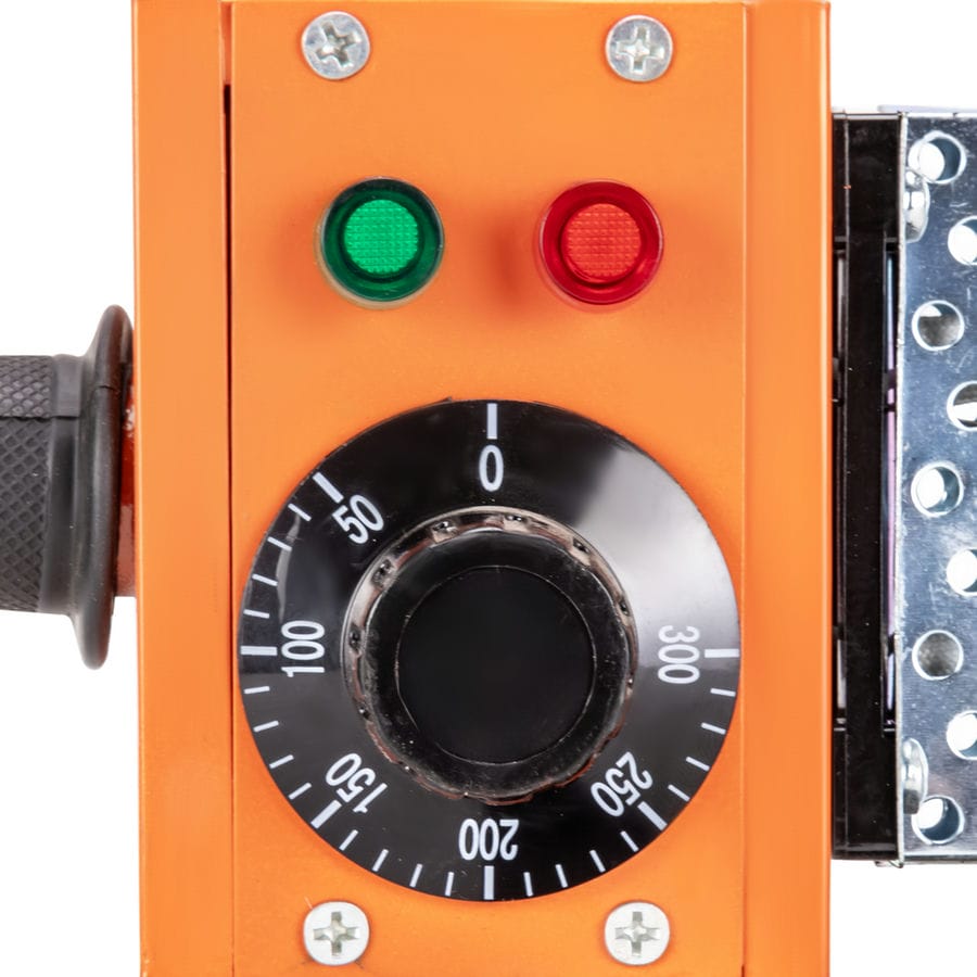 Система управления и индикации на FOXPLASTIC 2200 ZJM очень простая и состоит из вращающийся ручки со шкалой отражающая температуру от 50 до 300 ℃ и двух световых индикаторов красного и зелёного цветов.