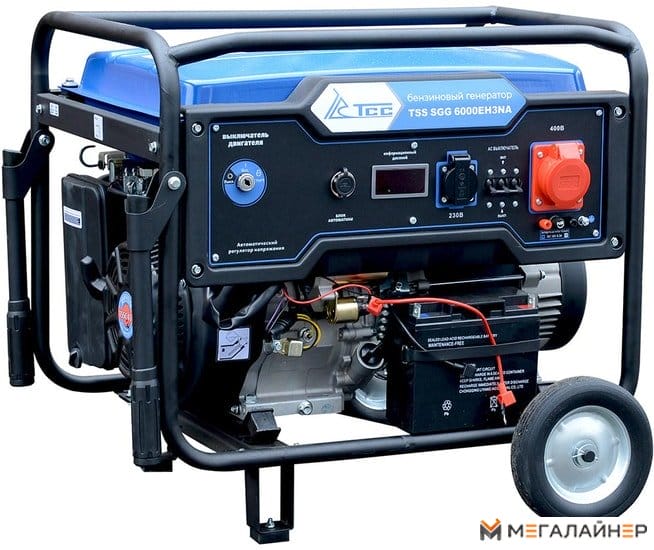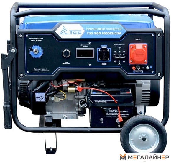 Трёхфазный бензогенератор ТСС SGG 6000EH3NA с комбинированным запуском и разъёмом для АВР. Номинальная мощность 6 кВт (при 380 В), максимальная 6.5 кВт. Предназначен для питания трёхфазного оборудования на стройке, в мастерской, на предприятии.