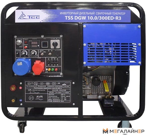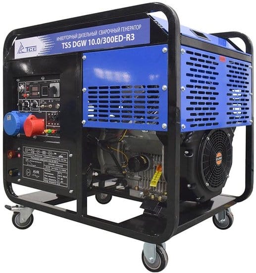 Дизельный сварочный генератор ТСС DGW 10.0/300ED-R3 — универсальная трёхфазная станция, совмещающая функции автономного источника электроэнергии и сварочного аппарата. Номинальная мощность 10 кВт (макс. 11 кВт), напряжение 380 В. Оснащён двигателем SV292F объёмом 997 см³ с воздушным охлаждением.