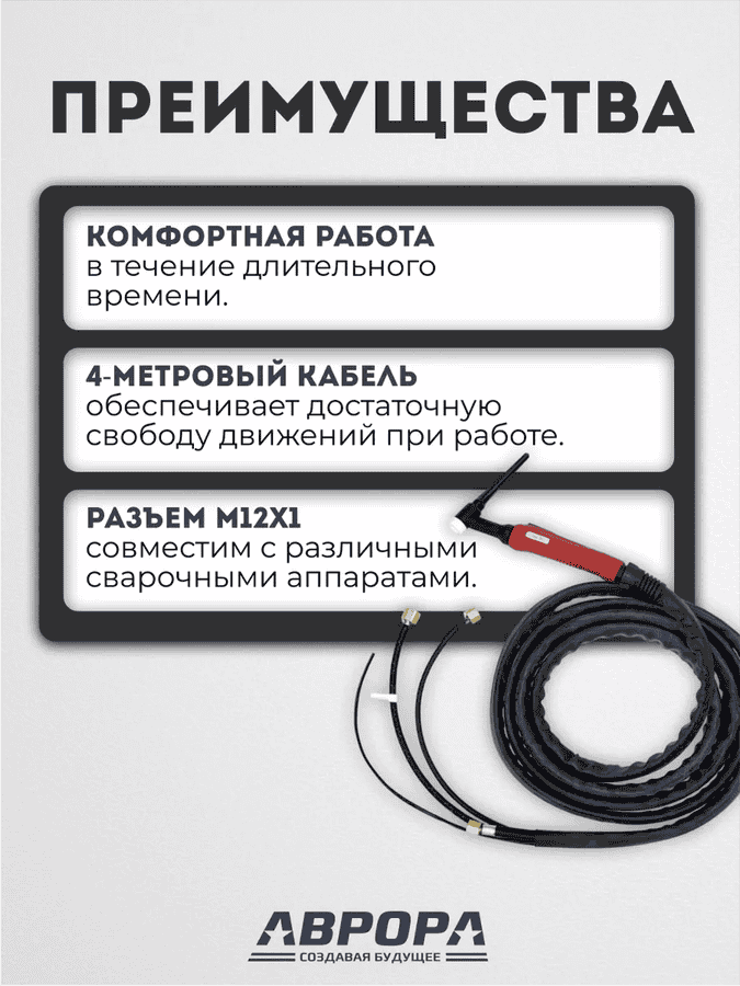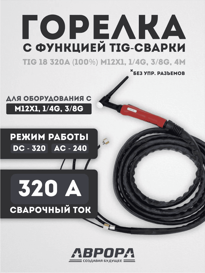 Горелка Aurora TIG 18 320A (100%) M12x1, 1/4G, 3/8G, 4m-вода (без управляющих разъемов)