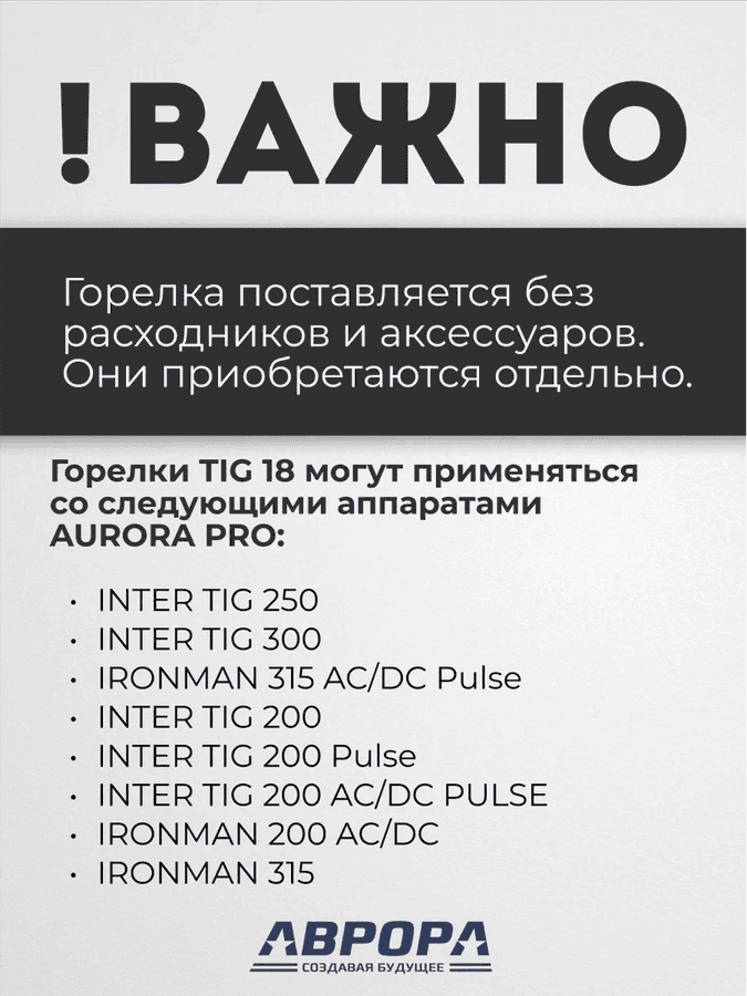 Горелки TIG 18 могут применяться со следующими аппаратами AURORA PRO: