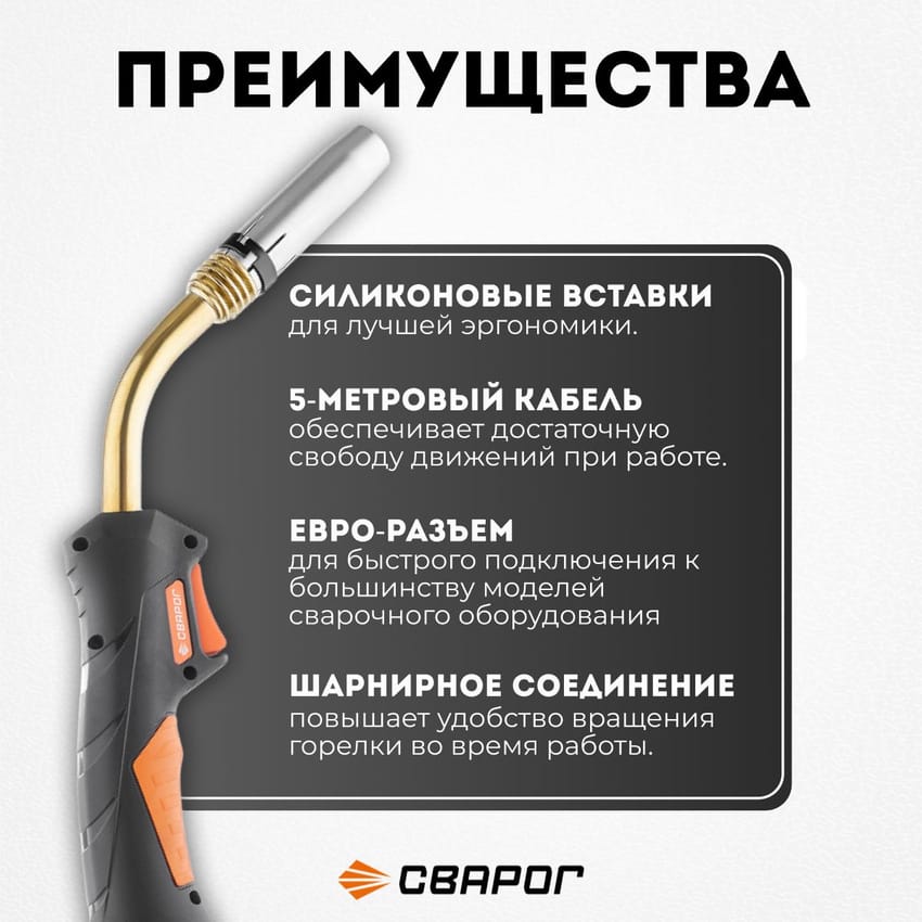 Шарнирное соединение повышает удобство вращения горелки во время работы. Также обеспечивается лучшее соединение между рукояткой и металлической пружиной. Надежная металлическая пружина исключает перегибание кабеля и обеспечивает более плавную подачу проволоки в любом положении горелки.