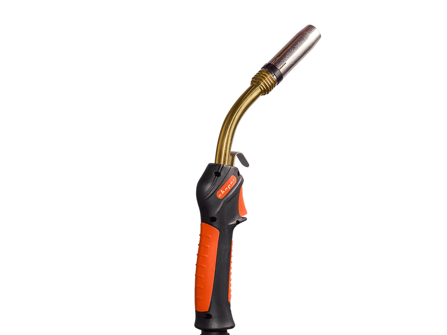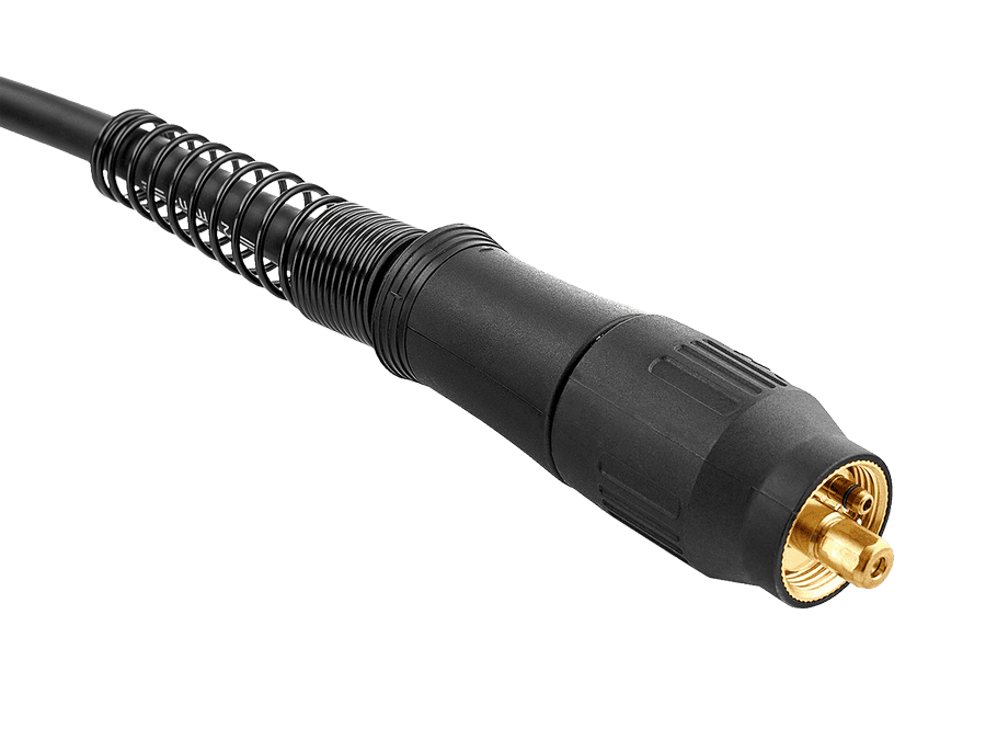 Шарнирное соединение повышает удобство вращения горелки во время работы. Также обеспечивается лучшее соединение между рукояткой и металлической пружиной. Надежная металлическая пружина исключает перегибание кабеля и обеспечивает более плавную подачу проволоки в любом положении горелки.