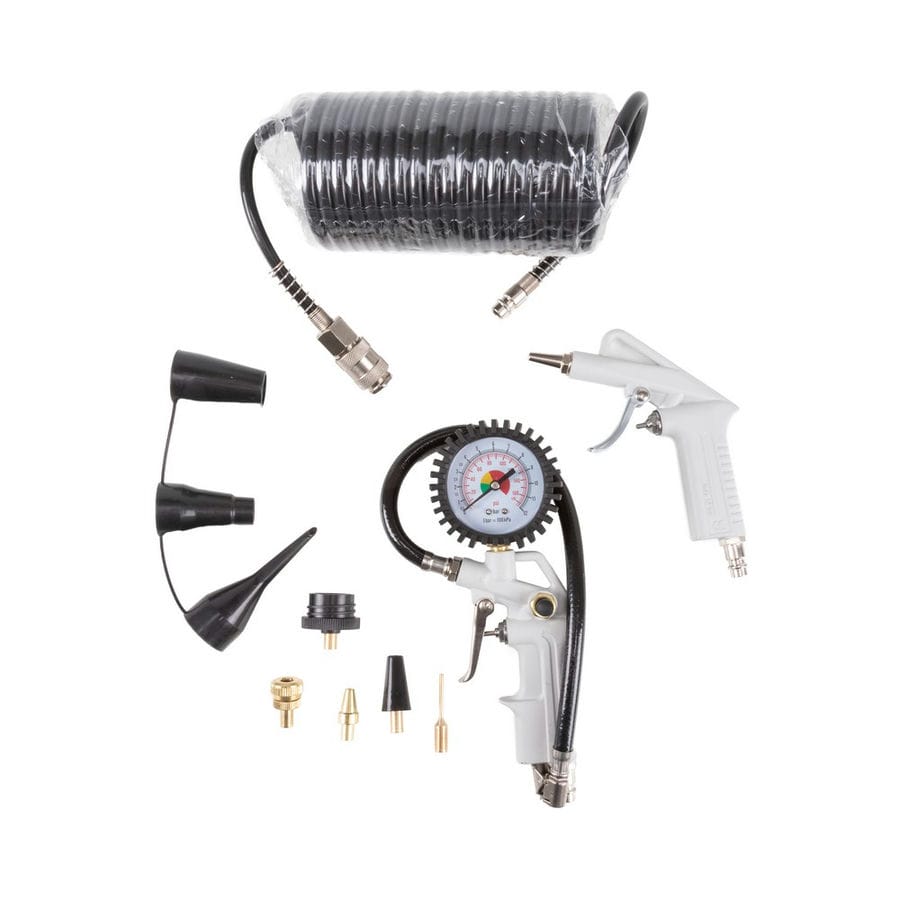 К компрессору прилагается пистолет для накачивания с манометром, продувочный пистолет, пневматический шланг, набор сопел и переходников. Комплект пневмоинструментов хранится внутри корпуса.