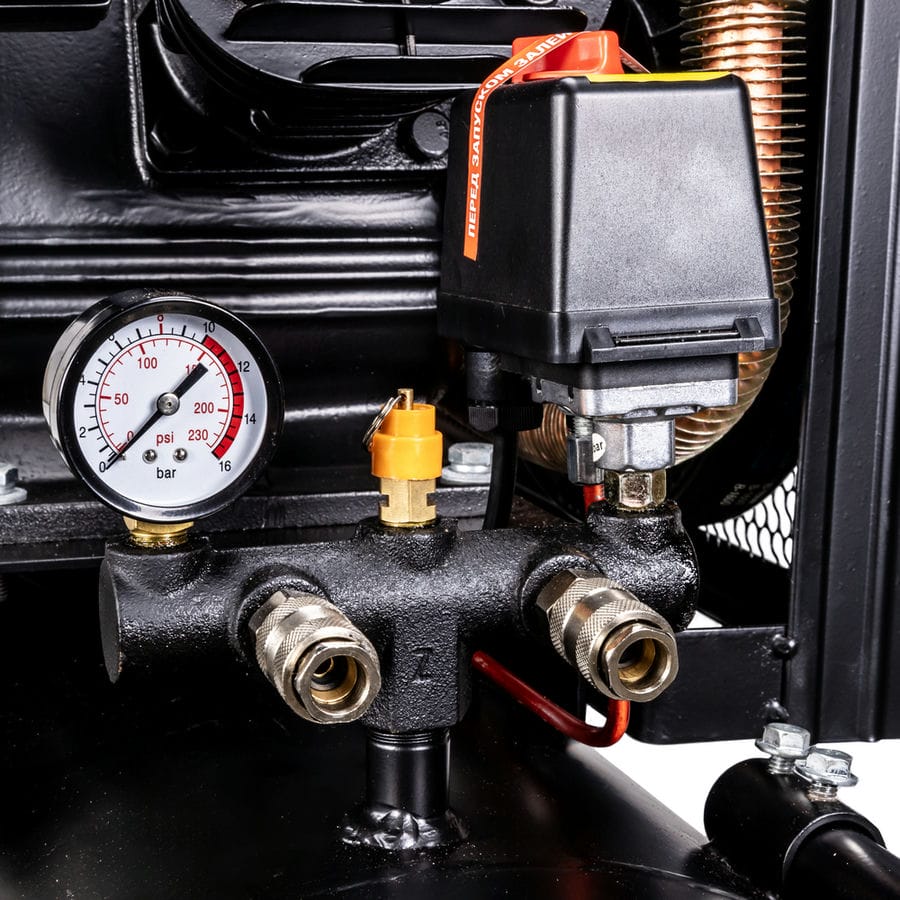 Трехпоршневой воздушный ременной масляный компрессор AEROMAX 700/150 предназначен для подачи воздуха под давлением в любой пневмоинструмент и оборудование, в т.ч. требующее большой расход воздуха такое как аппараты для плазменной резки и для покрасочных работ. Высокая производительность агрегата в 700 л/мин и 2 пневмовыхода позволяют использовать его на небольших производственных предприятиях. Агрегат отличается надежным исполнением и способен работать длительное время без перерывов. Четыре колеса и удобная высокая рукоять гарантируют легкость перемещения устройства по рабочей зоне. Ресивер имеет качественное покрытие, препятствующее образованию коррозии. Ременная передача закрыта решеткой, предотвращающей ее повреждение, а также травмирование пользователя в случае обрыва ремня. Наличие манометра обеспечивает удобный контроль давления в системе, а красная клавиша автоматического реле давления позволяет оперативно остановить работу ременного компрессора в случае неисправности.