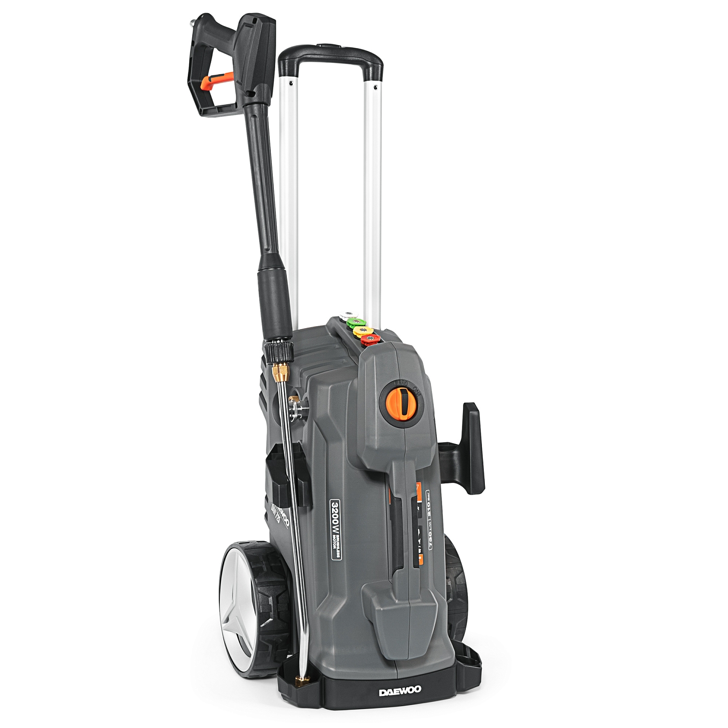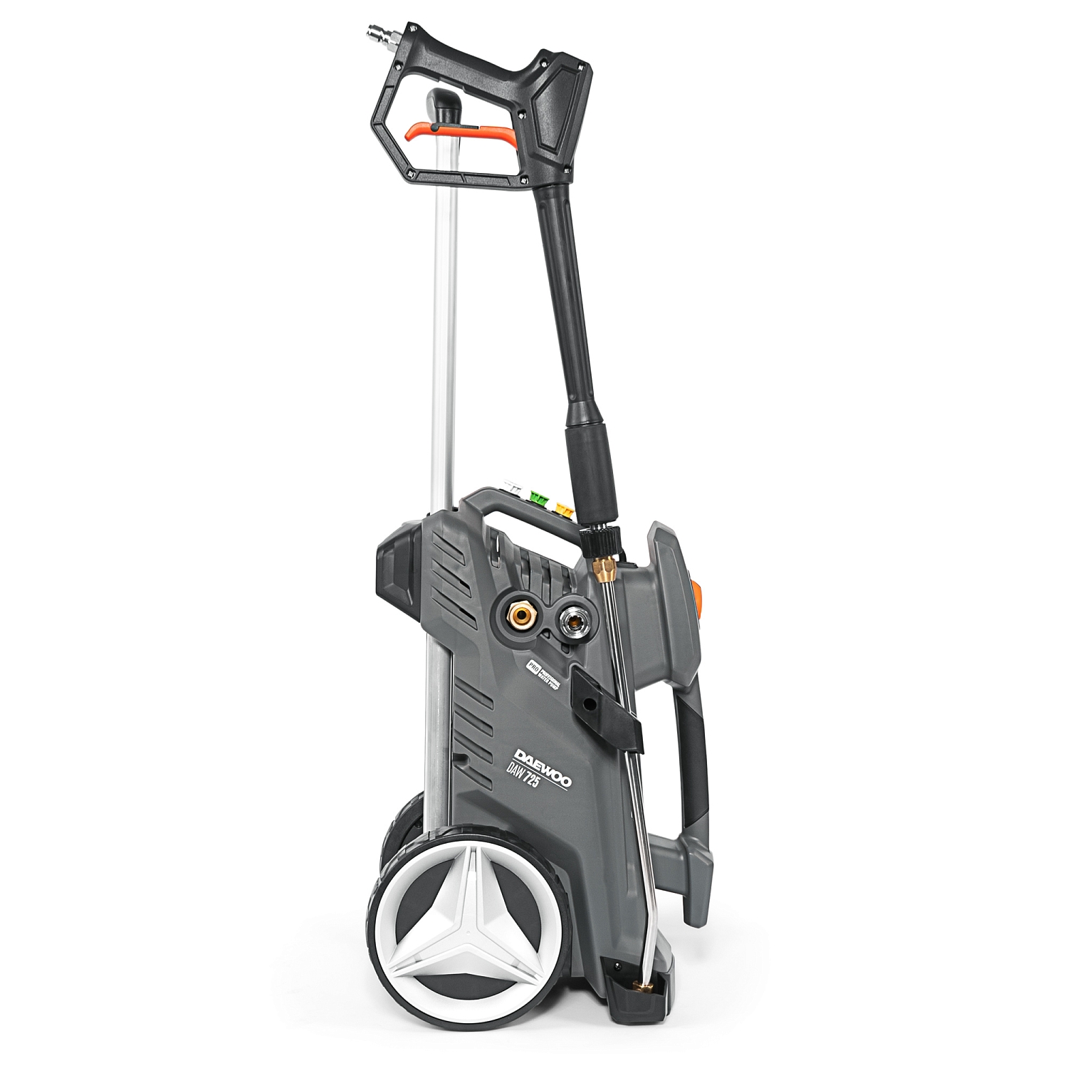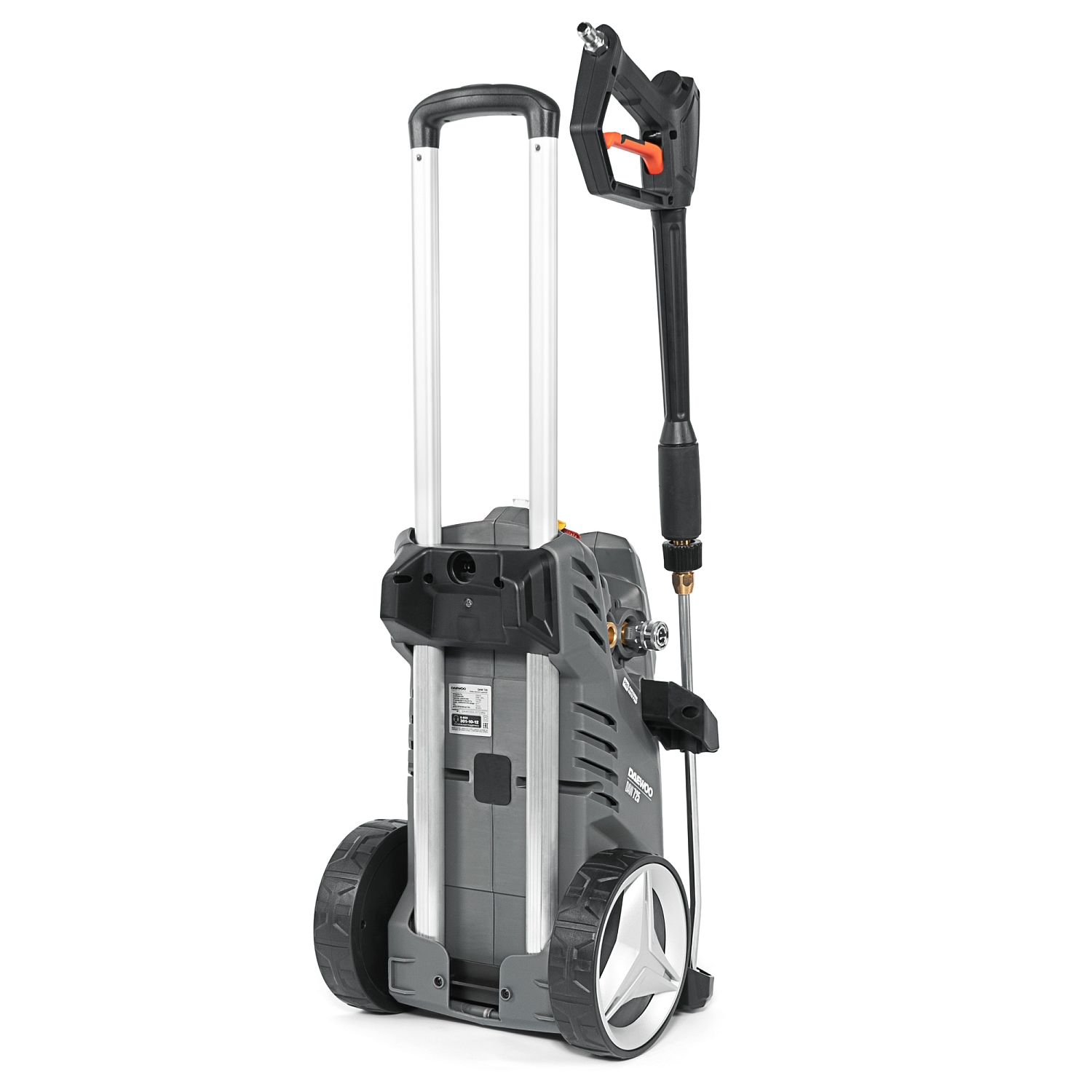 - Телескопическая рукоятка и большие колеса. Делают модель оптимально удобной при перемещении. Ручка-телескоп обладает повышенной эргономикой и позволяет подобрать оптимальную высоту при управлении агрегатом высокого давления.