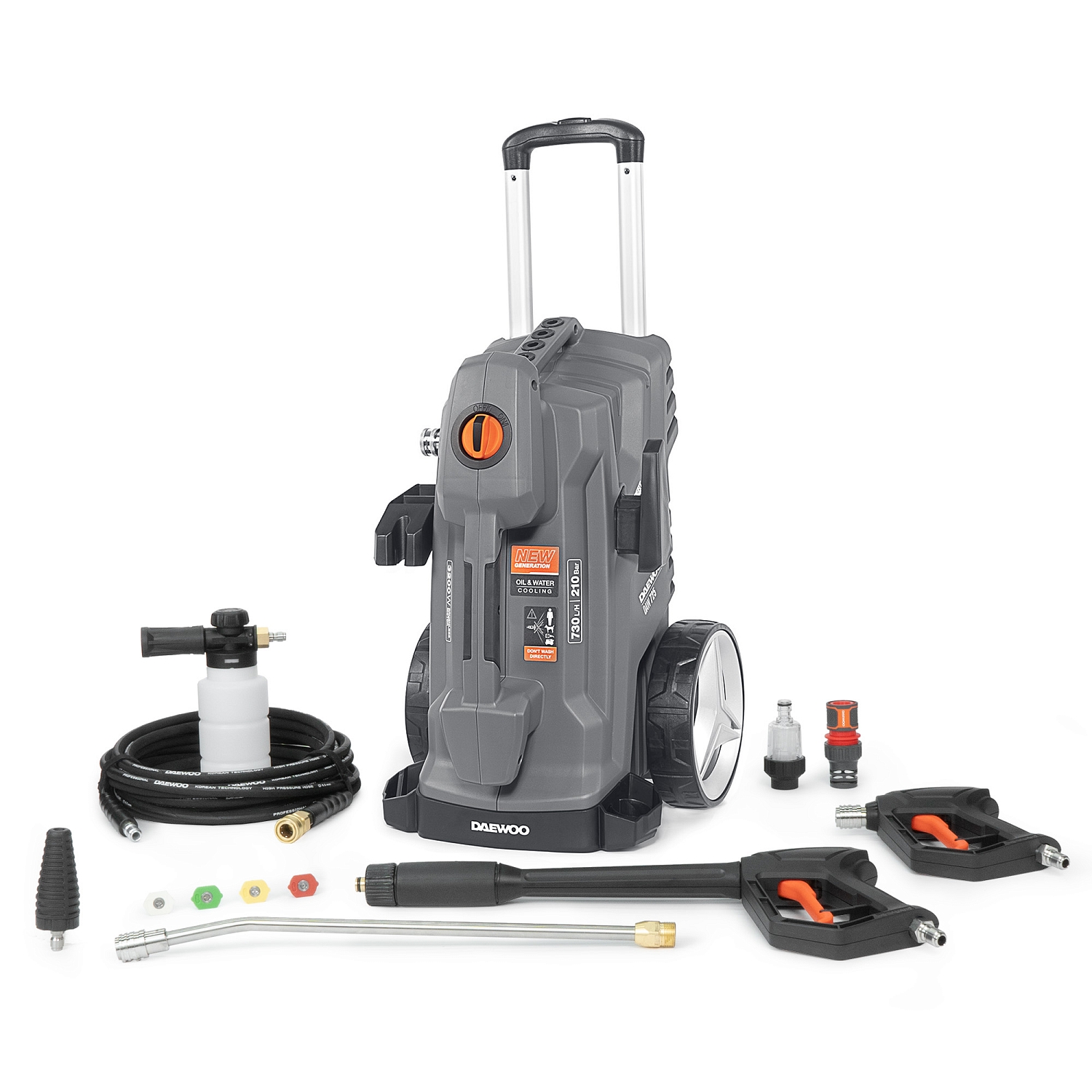 - Профессиональная помпа. Алюминиевая помпа с латунными поршням и рабочим давлением 210 бар. Работа поршней в масляной ванне и с водяной системой охлаждения, позволяет непрерывно работать без ограничений по времени. Поток 730 л/час, позволяет справляться с трудными загрязнениями.