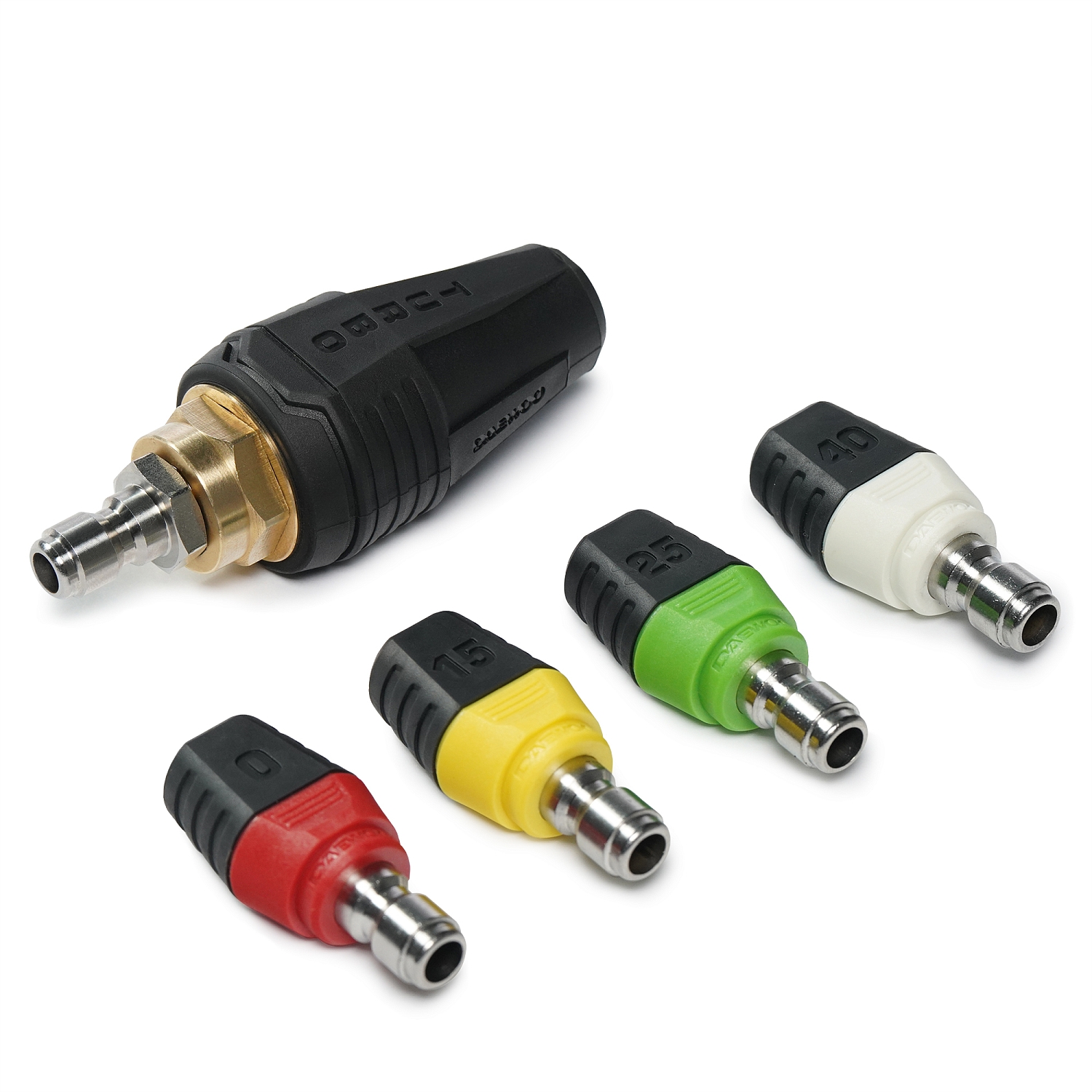 - Набор форсунок. В комплекте с мойкой поставляется набор эксклюзивных форсунок DAEWOO 0/15/25/40° с мягким покрытием, не оставляющим следов при случайном контакте с поверхностью. Форсунки удобно хранятся в гнездах на панели барабана.