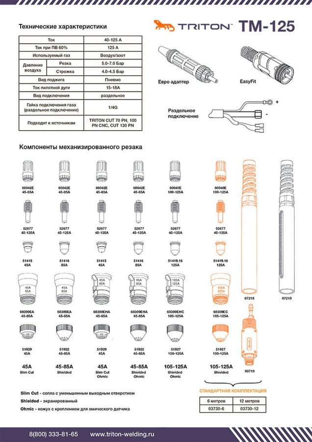 Плазмотрон для CNC с пневмоподжигом TM-125 (6 метров, раздельное подключение) подходит к аппаратам фирмы TRITON CUT 70 PN, 100 PN CNC, CUT 130 PN.