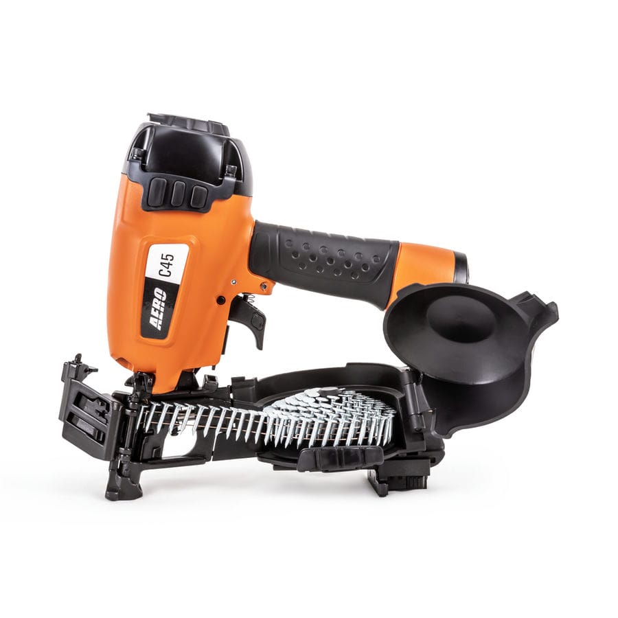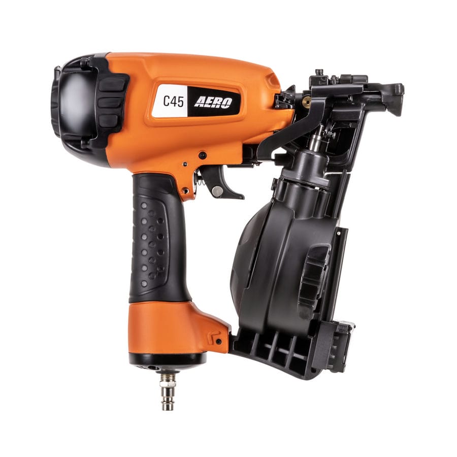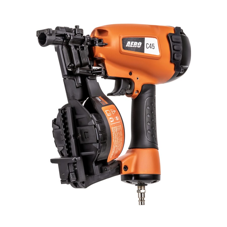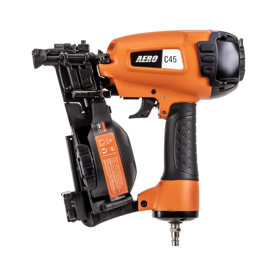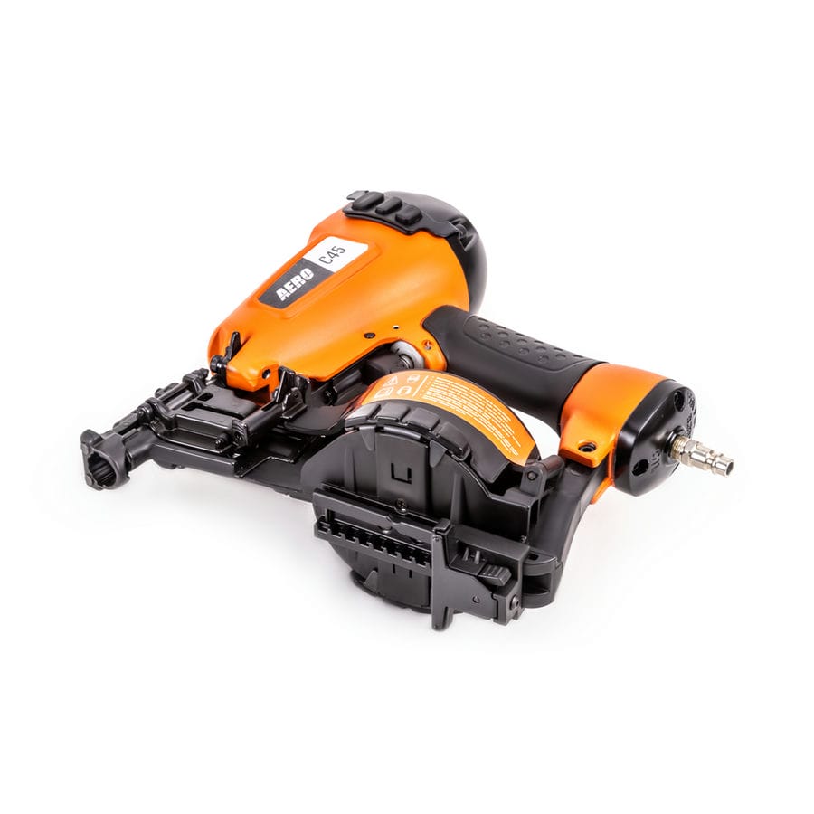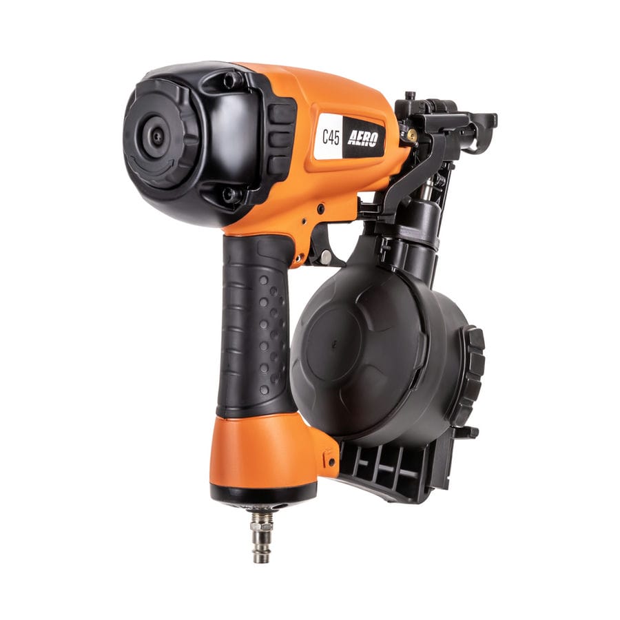 Кровельный пневматический гвоздезабивной пистолет или нейлер AERO C45 — мощный профессиональный инструмент для надежного забивания гвоздей в любую породу дерева. Предназначен для монтажа мягкой черепицы, кровельной дранки, обустройства заборов из мягких материалов и утепления черновых полов. Устройство позволяет регулировать глубину забивания гвоздей. Контактный предохранитель защитит от случайного выстрела. Удобный спусковой крючок обеспечит быструю работу. Инструмент использует кровельные барабанные гвозди CRN длиной от 19 до 45 мм. Поворотный дефлектор, находящийся на крышке инструмента, позволит выбрать наиболее комфортное для пользователя и окружающих направление выхода воздуха. Эргономичная прорезиненная рукоятка снижает усталость и дискомфорт во время работы. Для работы инструмента необходим воздушный компрессор и подготовленная воздушная магистраль. AERO C45 имеет следующие рабочие параметры — рабочее давление — 4,8 — 8,0 бар и расход воздуха — 1,2 л / выстрел (при 6,0 бар). Для быстрого и надежного подключения оснащается быстросьемным разъемом — Rapid M «папа».