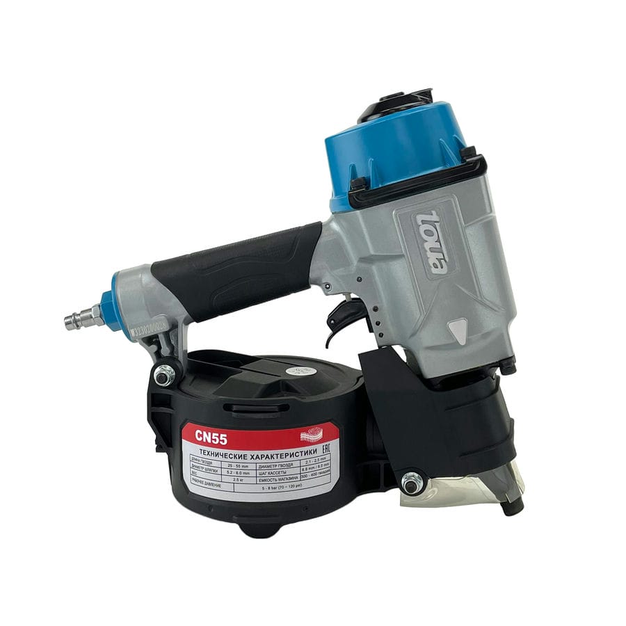 Toua CN55 гвоздезабивной пневматический пистолет барабанного типа работает с гладкими, ершеными и винтовыми гвоздями соединенными между собой проволокой. Обладает высокой производительностью, большим ресурсом и низкой стоимостью точки крепления. Подходит для работ на производстве и конвейерной сборки.