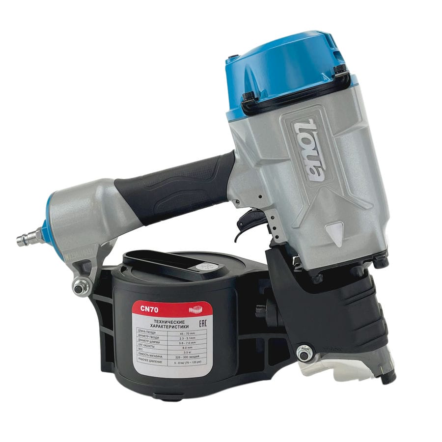 Toua CN70 гвоздезабивной пневматический пистолет барабанного типа работает с гладкими, ершеными и винтовыми гвоздями соединенными между собой проволокой. Обладает высокой производительностью, большим ресурсом и низкой стоимостью точки крепления. Подходит для работ на производстве и конвейерной сборки.
