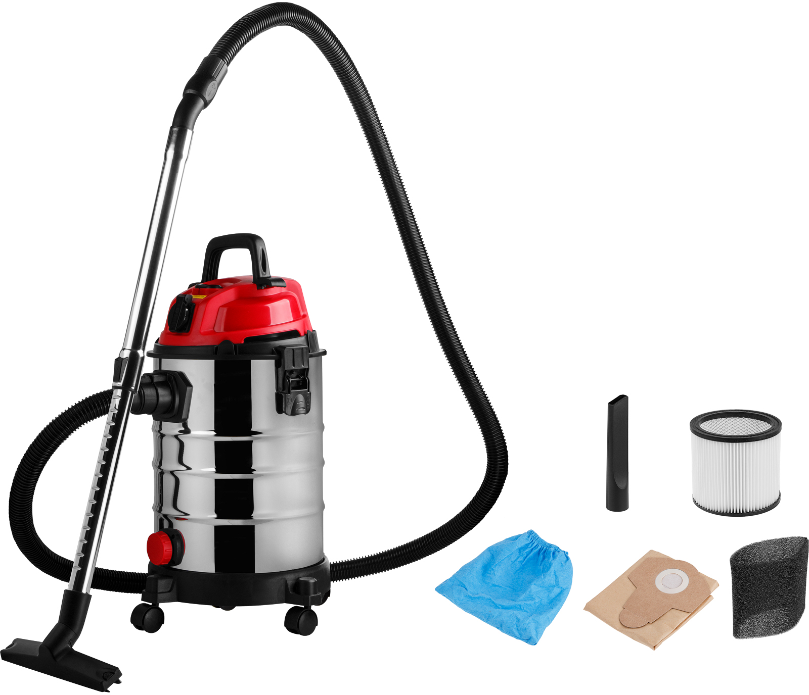Несколько степеней фильтрации обеспечивается за счет фильтра тонкой очистки (HEPA), который входит в комплект поставки. Возможно также использовать с одноразовыми бумажными мешками. Пылесос также оснащен специальным отверстием для слива воды из бака. А легкий и прочный корпус из нержавеющей стали обеспечит долгий срок службы инструмента. Присутствует функция выдува, а также телескопическая трубка. Обладает раздвижной телескопической трубкой и трехпозиционным переключателем.