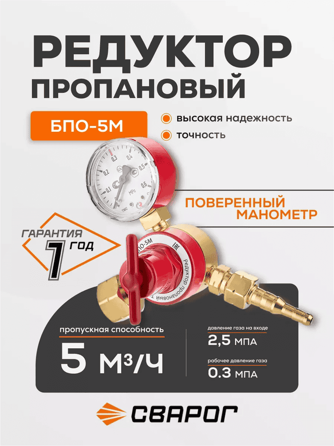Редуктор пропановый БПО—5М С поверенным манометром предназначен для понижения давления поступающего из баллона газа и автоматического поддержания постоянным заданного рабочего давления при газопламенной обработке и смежных процессах.