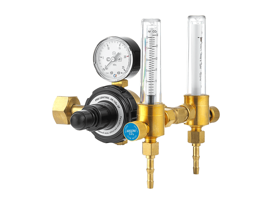 Регулятор расхода газа PRO CONTROL AR/CO2 2Р с поверенным манометром и двумя расходомерами для углексислого газа и аргона предназначен для понижения давления поступающего из баллона газа и автоматического поддержания постоянным заданного расхода при питании постов, установок в среде защитных газов, а также смежных процессов.