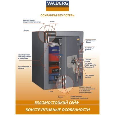 При производстве сейфов Valberg используется только высококлассная листовая сталь толщиной не менее 3 мм. В качестве замков, чаще всего, используется известная своей надежностью продукция немецкой компании Kaba Mauer. Использование различных сочетаний типов замков, большой диапазон внутренних и внешних типоразмеров, пятилетняя гарантия от производителя, высокое качество и умеренная цена обеспечивают сейфам Valberg заслуженную популярность среди российских покупателей.