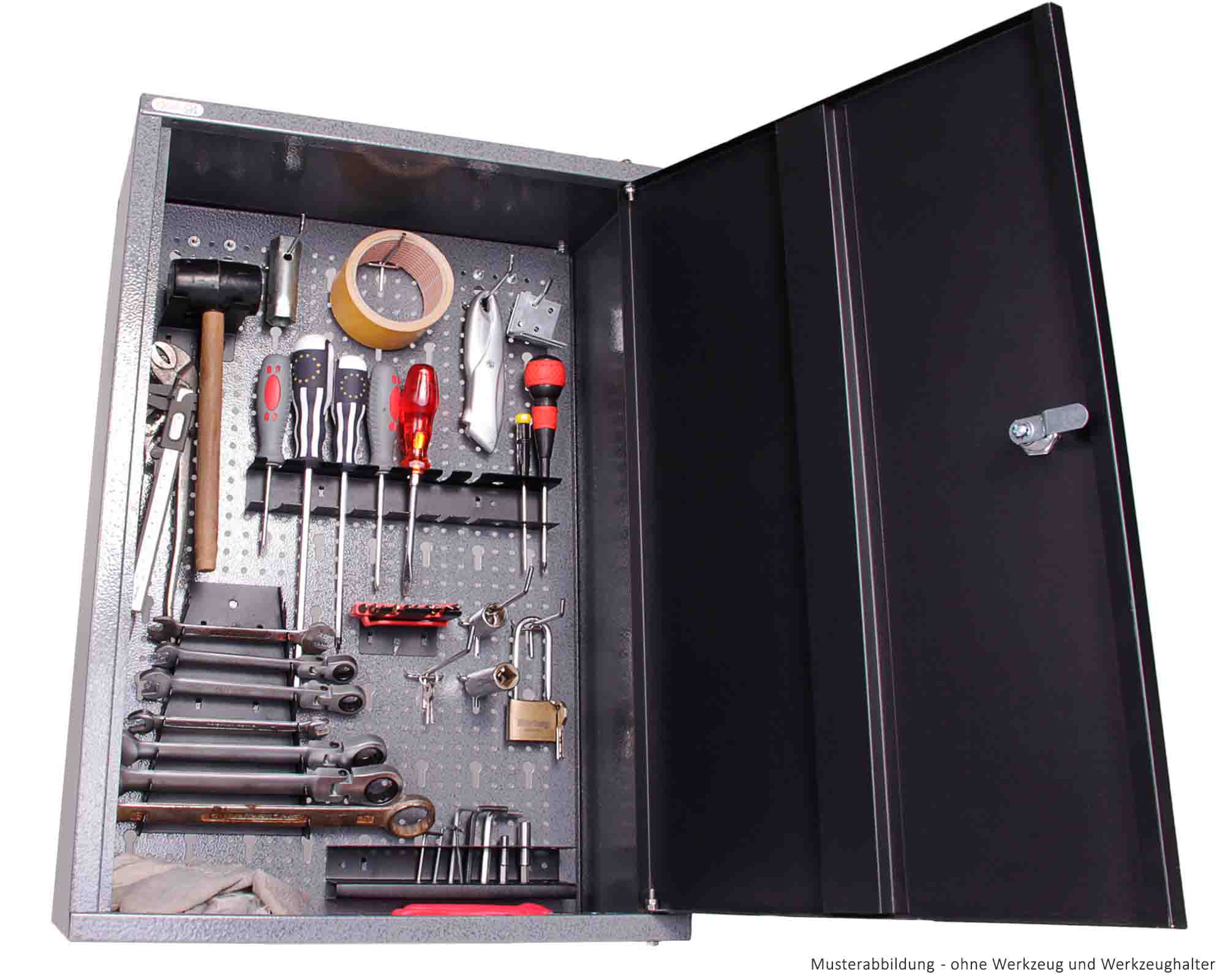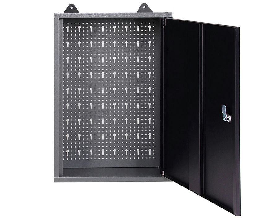Металлический шкаф для мастерской, с запираемой дверцей, перфорированной стенкой для подвешивания инструментов. Грузоподъемность до 30