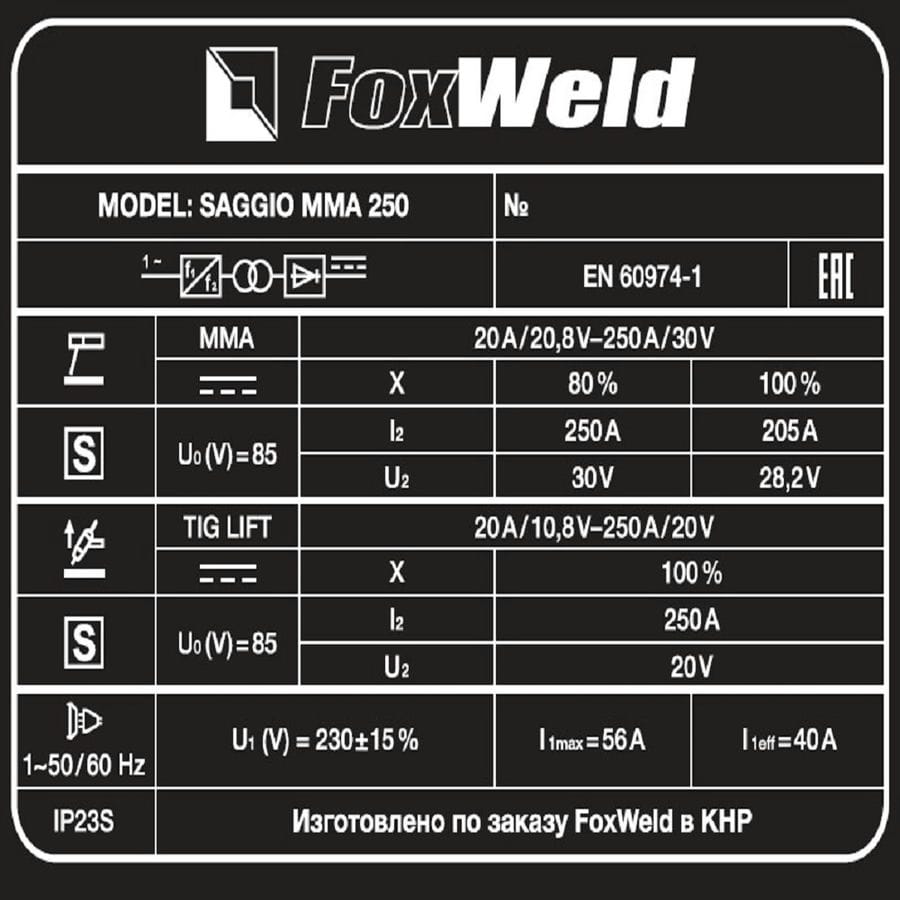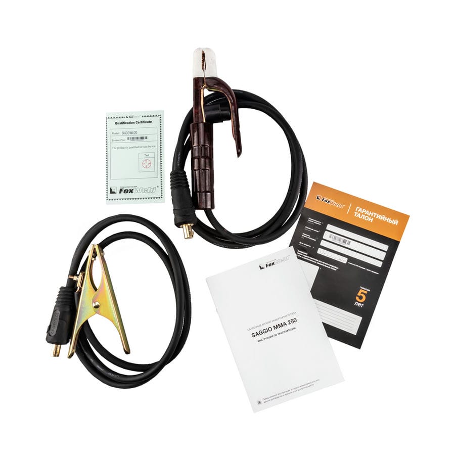 | Комплект поставки | Сварочный аппарат FOXWELD SAGGIO MMA 250 – 1 шт.; Электрододержатель с кабелем 300 А, медь – 1 шт.; Зажим на массу с кабелем |