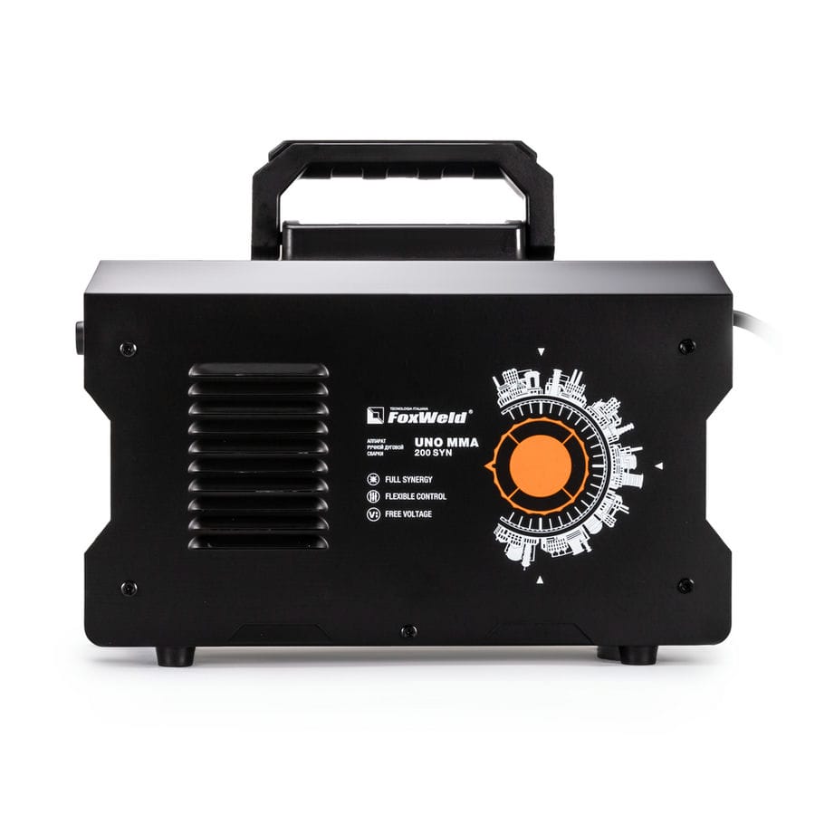 Сварочный аппарат FOXWELD UNO MMA 200 SYN c синергетическим управлением предназначен для ручной дуговой сварки (MMA) любыми типами электродов, а также для сварки вольфрамовыми электродами в среде инертного газа аргон (TIG LIFT). В модели есть полноценная синергетика, которая рекомендует соотношение параметра силы тока сварки к толщине свариваемого сплава металла. Для облегчения процесса сварки в режиме ММА и получения более качественного сварного соединения аппарат имеет регулируемые функции Нot Start (горячий старт) и Arc Force (форсаж дуги), а также AntiSticking (антиприваривание) с возможностью отключения. Функция VRD повышает безопасность и исключает риск поражения сварщика электрическим током. Процесс сварки становится более безопасным в замкнутых пространствах и при сварке в условиях повышенной влажности. Режим TIG LIFT позволяет проводить аргонодуговую сварку на постоянном токе изделий из черной и нержавеющей стали. Данный вид сварки характеризуется отсутствием брызг и более презентабельным внешним видом сварного шва. Для проведения аргонодуговой сварки необходимо дополнительно приобрести горелку с вентилем и баллон с газом аргон.