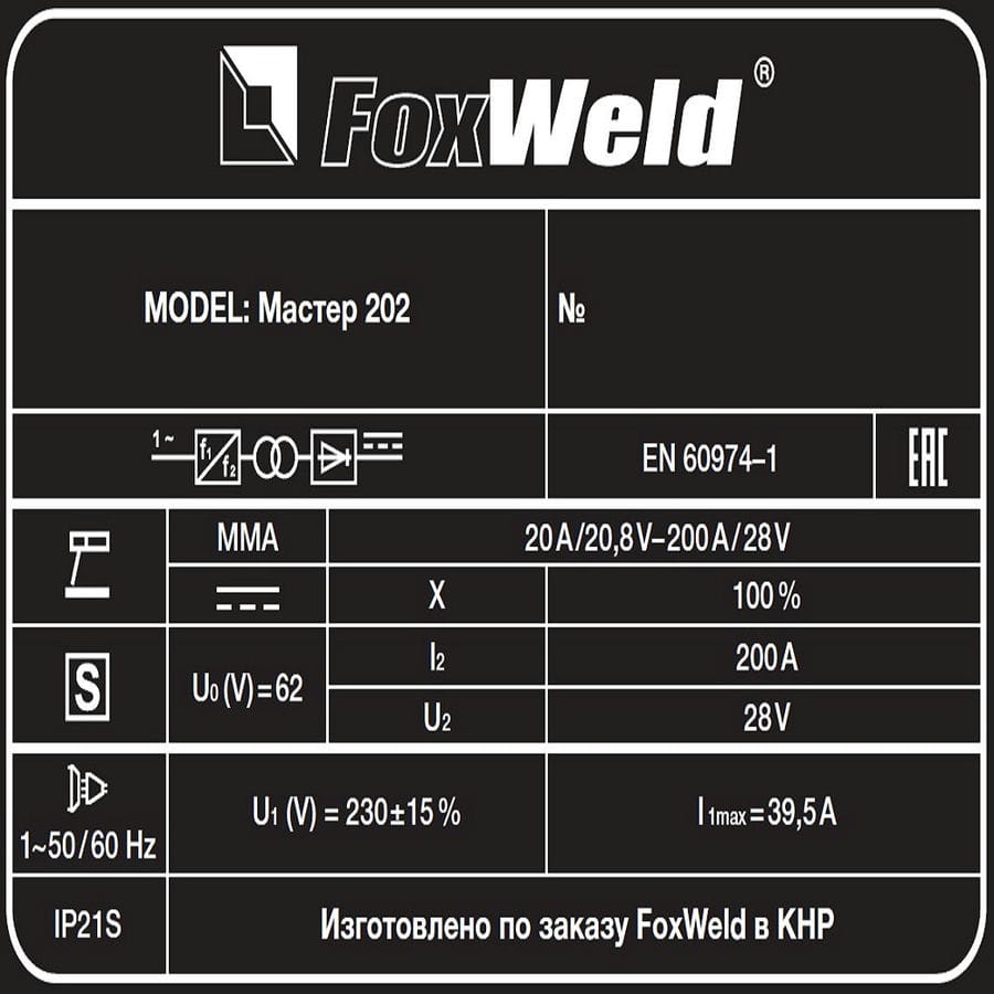 | Комплект поставки | Сварочный аппарат FOXWELD МАСТЕР 202 – 1 шт.; Электрододержатель 300 А, 3 м – 1 шт.; Зажим заземления 300 А, 3 м – 1 шт.; Щёт |