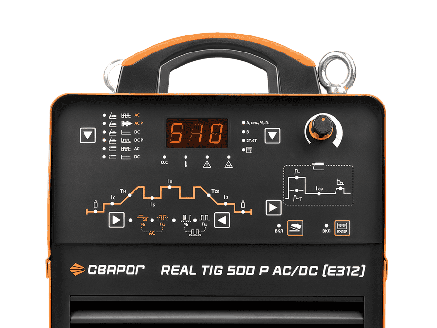 REAL TIG 500 P AC/DC (Е312)— это промышленный многофункциональный сварочный аппарат для аргонодуговой сварки (TIG DC, TIG AC, TIG AC/DC PULSE) и ручной дуговой сварки покрытым электродом (ММА DC, ММА AC)