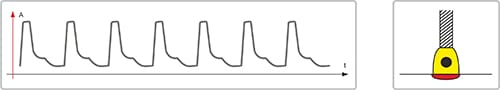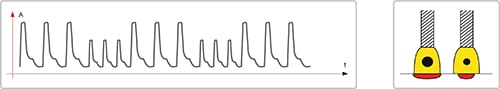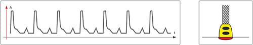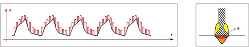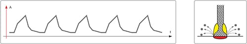 Технология ПУЛЬС с высокой скоростью переноса. Высокая динамика переноса позволяет добиться более глубокого проплавления, одновременно со снижением теплового влияния на зону вокруг сварочного шва и увеличить скорость сварки.