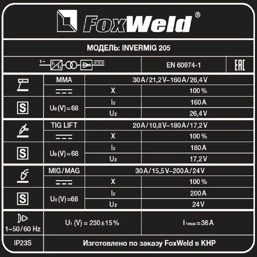 | Комплект поставки | Сварочный полуавтомат Foxweld Invermig 205 – 1 шт.; Горелка MIG MB-15AK, 3 м – 1 шт.; Зажим заземления 200 А, 3 м – 1 шт.; Газовый ру |