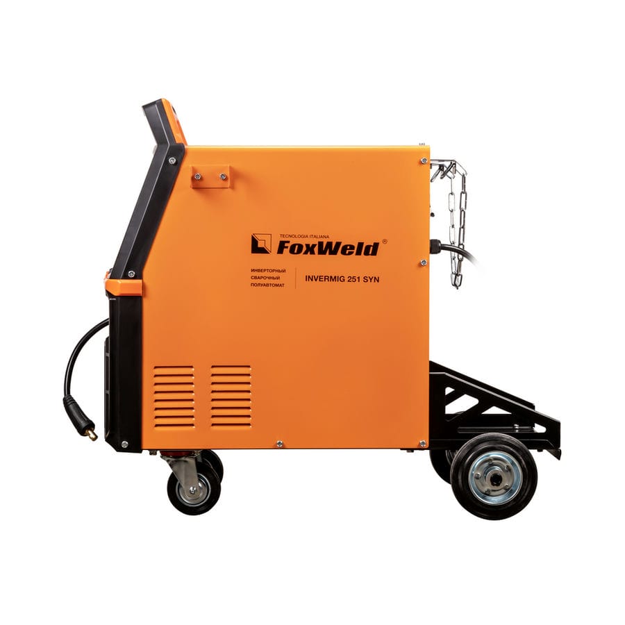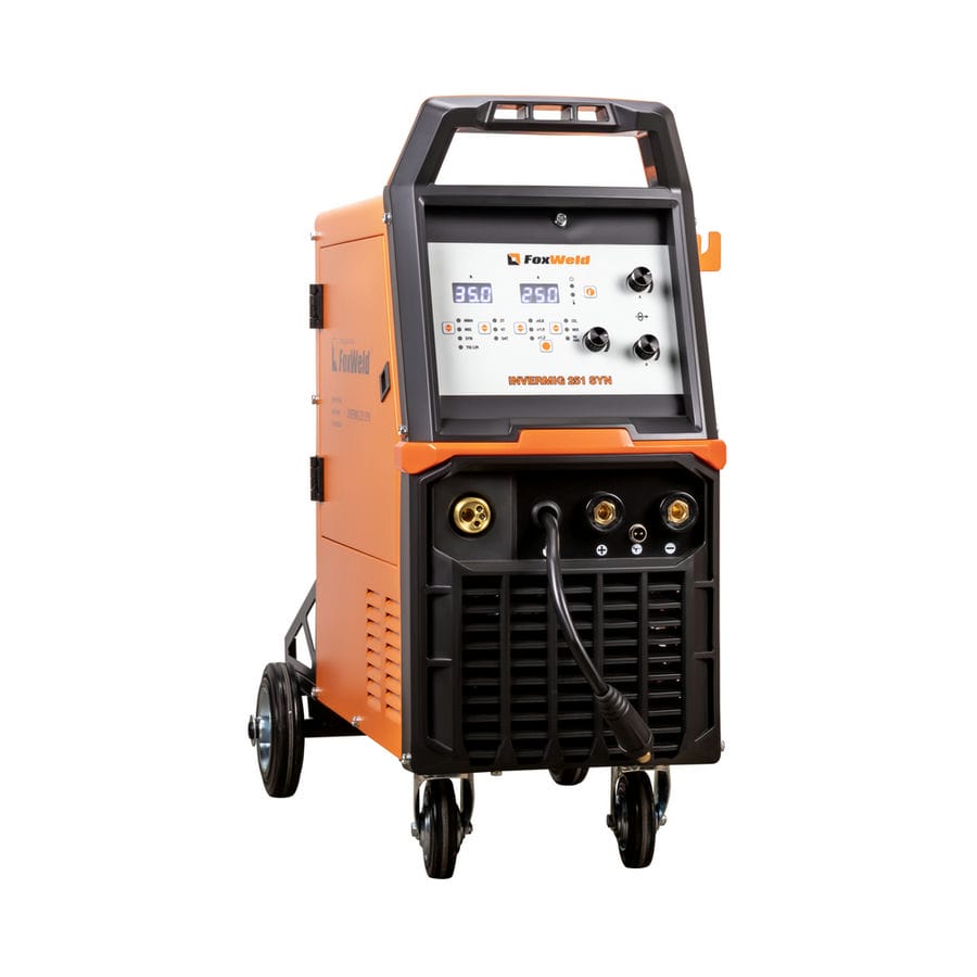 FOXWELD INVERMIG 251 SYN — промышленный многофункциональный трёхфазный синергетический инвертор, позволяющий производить сварку изделий из низкоуглеродистой и легированной стали и алюминия. Аппарат выполнен в едином корпусе со встроенным мощным 4-роликовым механизмом подачи проволоки, рассчитанным для использования катушек D200 (5кг) и D300 (15 кг). 2 цифровых дисплея на панели управления, мощная ручка на корпусе, платформа на колёсах для перемещения с местом для установки баллона с газом – в аппарате есть всё для проведения сварочных работ в сервисных металлоцентрах и при монтаже различных металлоконструкций.