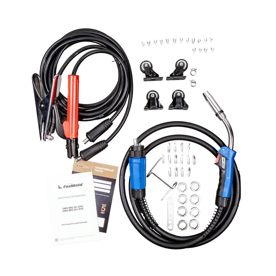 Горелка, хомуты для газового шланга, комплект роликов и наконечников позволяют быстро приступить к работе.