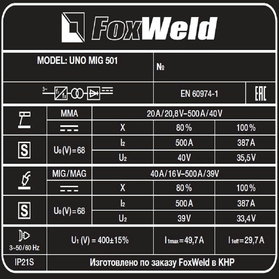| Комплект поставки | Сварочный полуавтомат Foxweld UNO MIG 501 – 1 шт.; Горелка MIG-40KD с кабелем, 3 м – 1 шт.; Внешний механизм подачи проволоки |