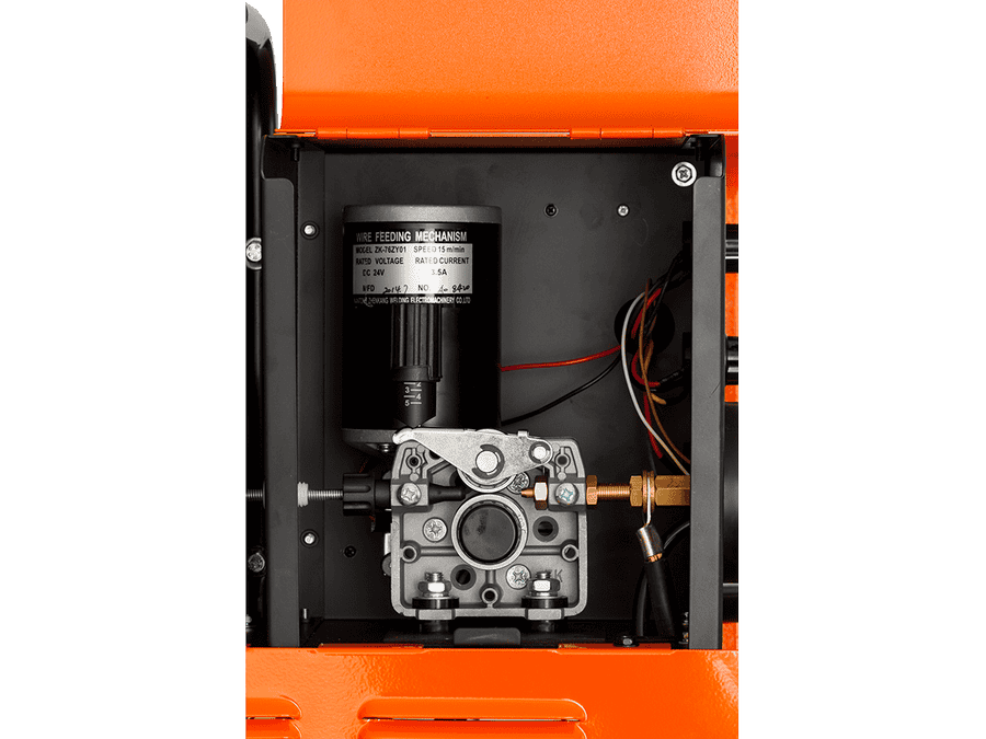 - Мощный электромотор и двухроликовый механизм подачи проволоки обеспечивает плавный и безрывковый процесс сварки на всех этапах