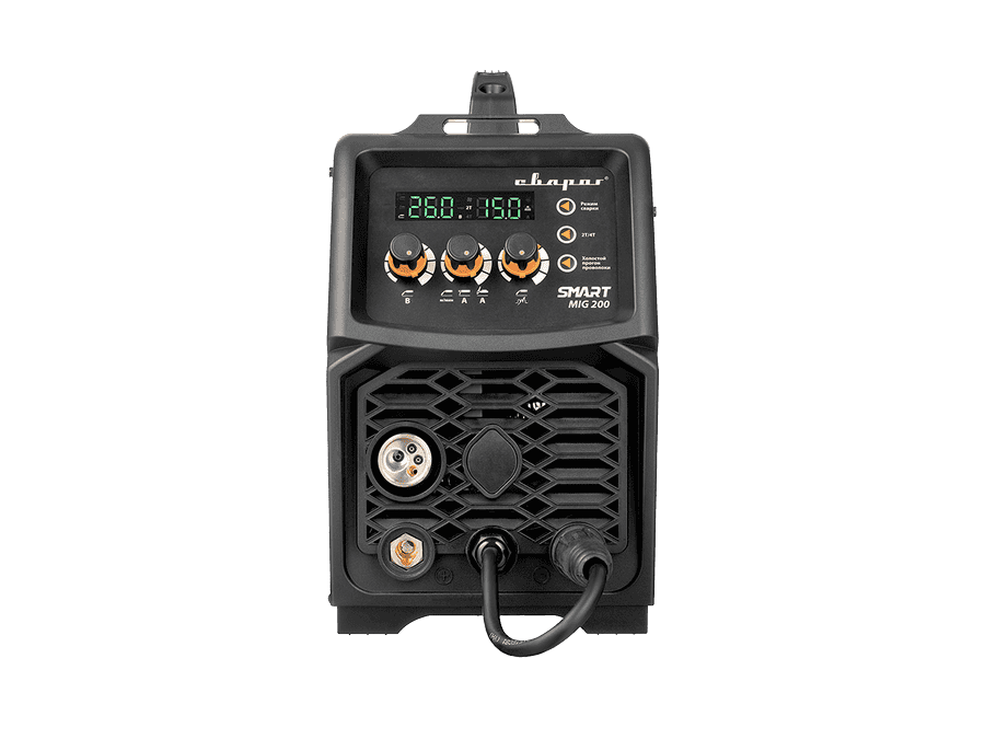 REAL SMART MIG 200 (N2A5) – универсальный, многофункциональный инвертор для полуавтоматической сварки сплошными и порошковыми проволоками (MIG/MAG), для ручной дуговой сварки покрытыми электродами (MMA), а также аргонодуговой сварки неплавящимся электродом (TIG). Все режимы являются полноценными и каждый содержит большой набор вспомогательных функций.