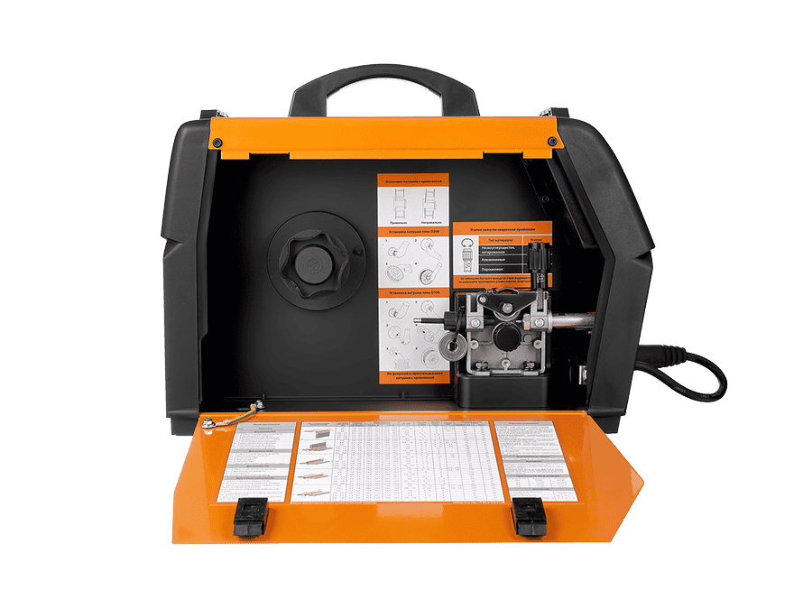 - На дверце бункера расположена таблица с настройками для MIG и MMA сварки. Также указана информация по установке катушки с проволокой и регулировки зажатия сварочной проволоки. Это особенно полезно для тех, кто только начинает осваивать сварку