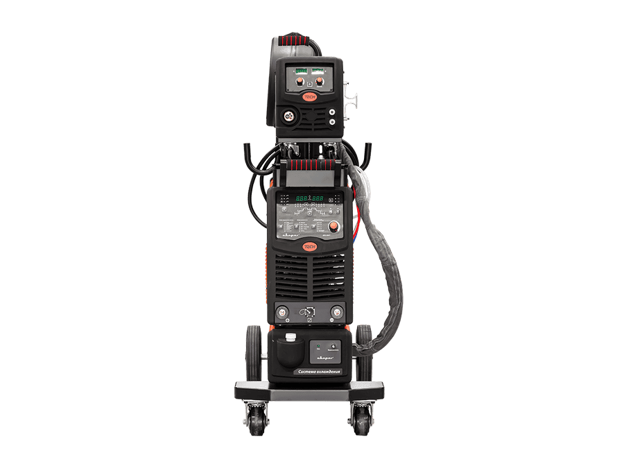 - Блочная система на прочной тележке: источник сварочного тока, подающее устройство и теплообменник