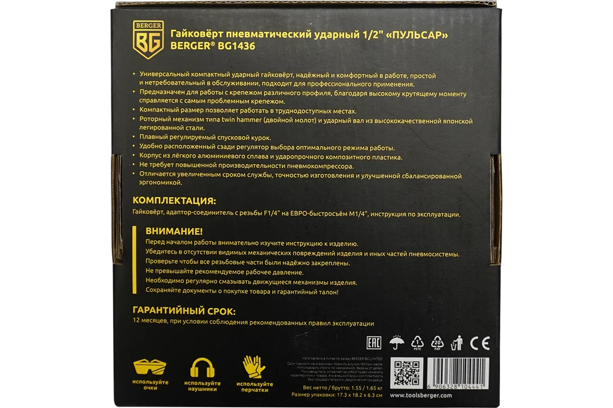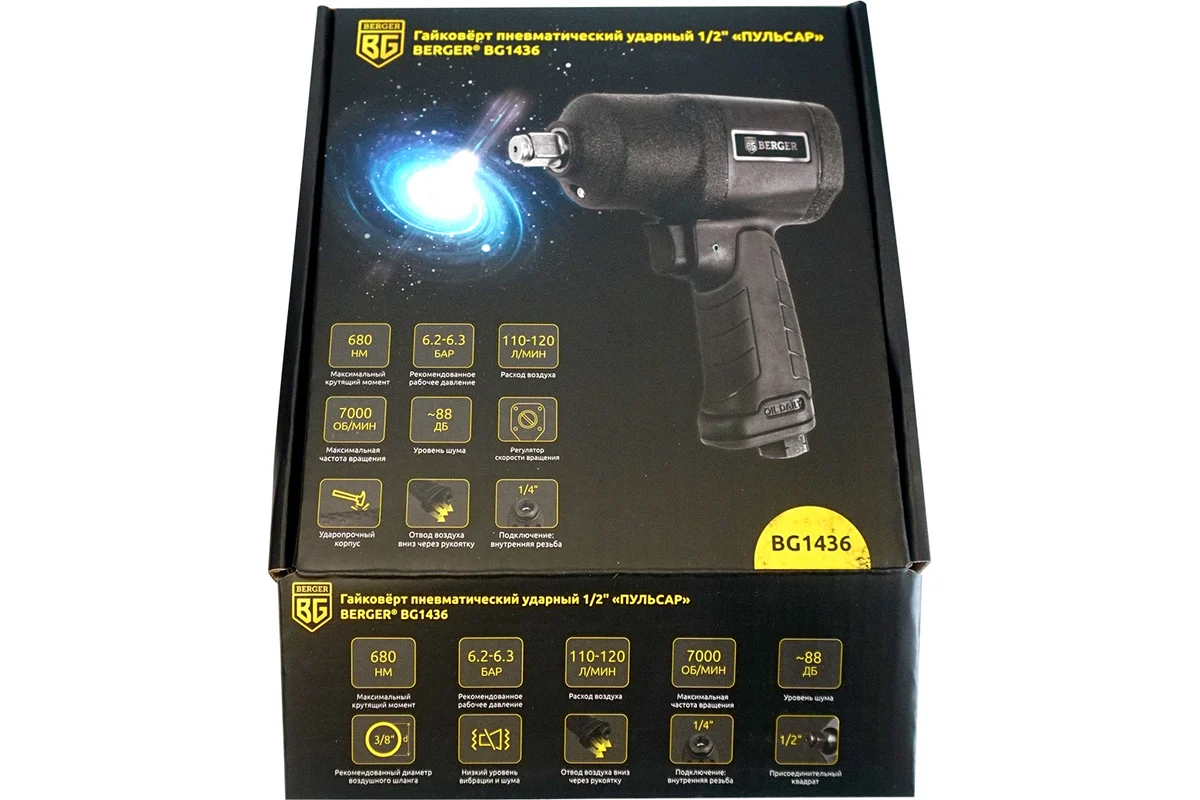 ГАЙКОВЁРТ ПНЕВМАТИЧЕСКИЙ УДАРНЫЙ 1/2″ «ПУЛЬСАР» BERGER BG1436 – универсальный компактный ударный гайковёрт профессионального качества, надёжный и комфортный в работе, простой и нетребовательный в обслуживании. Предназначен для монтажа и демонтажа резьбовых соединений на производственных линиях, станциях технического обслуживания и прочих специализированных предприятиях. Компактный размер позволяет работать в труднодоступных местах. Благодаря высокому крутящему моменту, эффективно работает с прикипевшим крепежом. Роторный механизм типа Twin Hammer (двойной молот) и ударный вал из высококачественной японской легированной стали. Плавный регулируемый спусковой курок. Удобно расположенный сзади 4-х уровневый регулятор выбора оптимального режима работы.Корпус из лёгкого алюминиевого сплава и ударопрочного композитного пластика. Не требует повышенной производительности пневмокомпрессора. Отличается увеличенным сроком службы, точностью изготовления и улучшенной сбалансированной эргономикой.